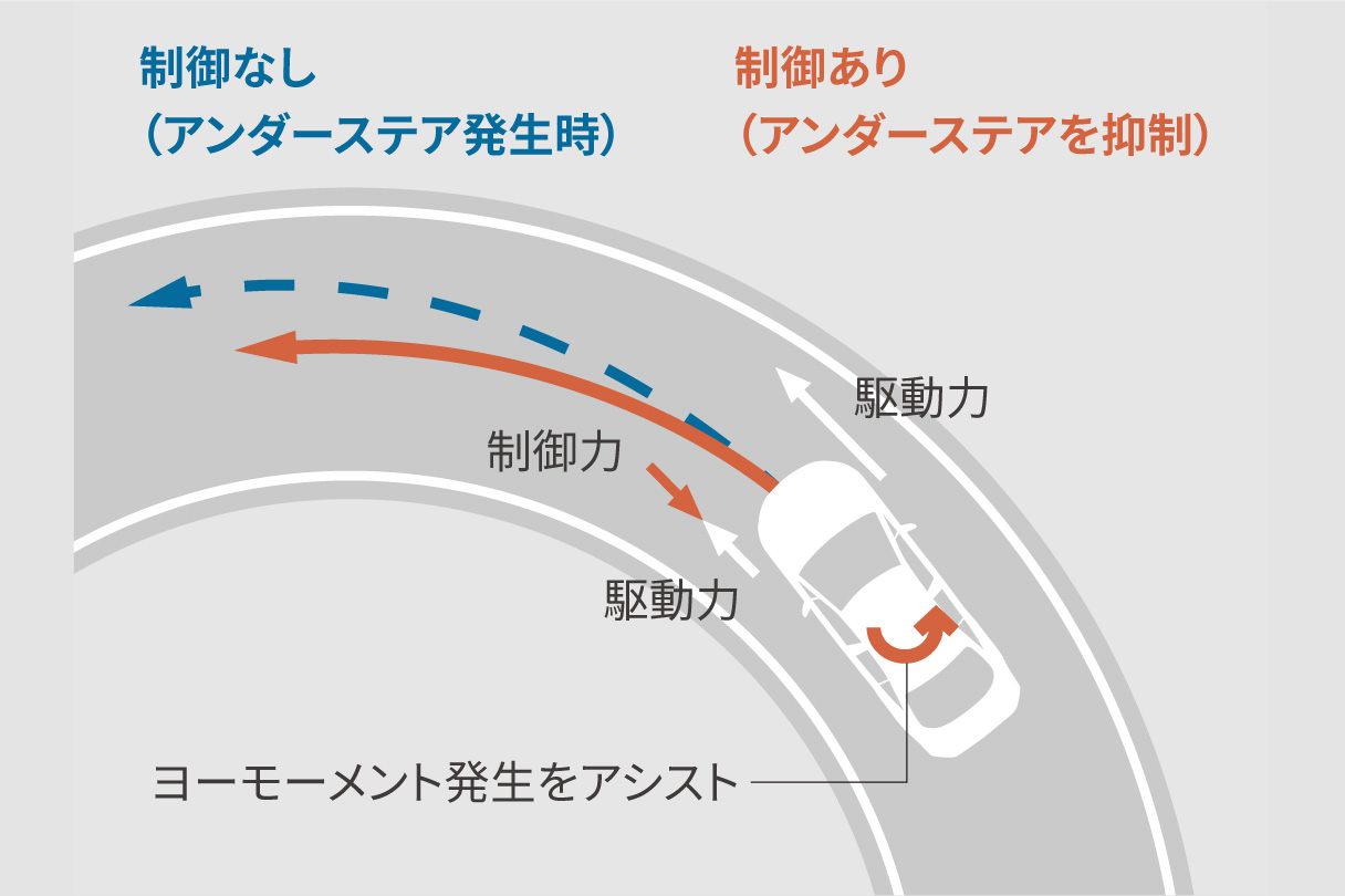 ワインディング走行等のシチュエーションにおいて、ブレーキ制御により内輪の駆動力を調整し、コーナリングをアシストします。