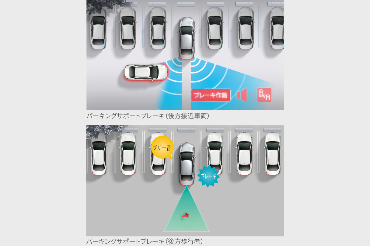 スイッチを押すだけで駐車操作を支援してくれるアドバンスト パーク。並列駐車においては、バック駐車、前向き駐車、バック出庫、前向き出庫が可能です。ステアリング、アクセル、ブレーキ、シフトの全操作をクルマが支援してくれるため、安心してラクに停められます。また、カメラやソナーによって、周囲を監視しながら駐車を支援。障害物を検知した場合には警報を鳴らし、ブレーキ制御を行うことで接触回避を支援します。