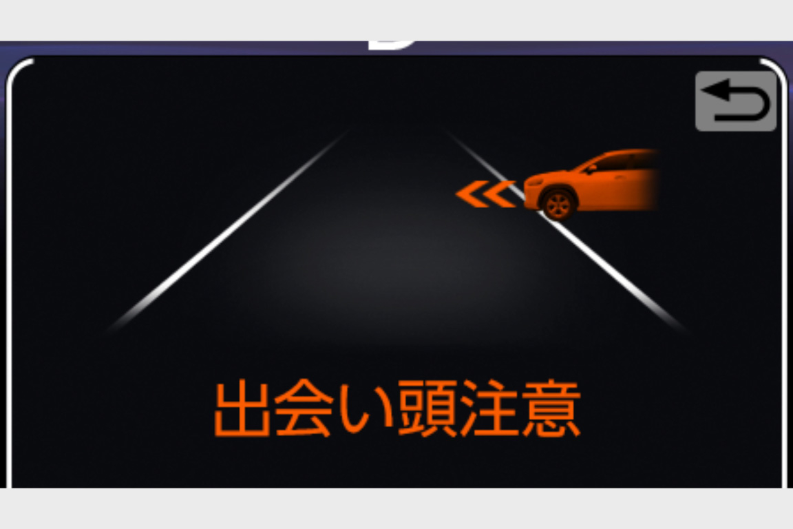 交差点右折時、クルマ同士の直接通信で死角の対向車を検知。接近している対向車がいるにもかかわらずドライバーが発進しようとした場合に、表示とブザー音による注意喚起を行い、安全に右折できるよう支援します。